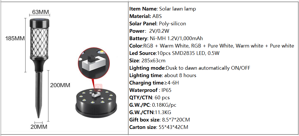 | jeneng item: | Lampu rumput surya | Bahan: | ABS |
